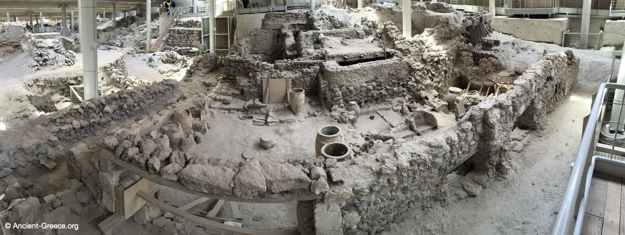 Unlike many contemporaneous sites where only foundations remain, the multi-storey buildings of Akrotiri stand several meters high, still containing the pithoi (storage jars) and celebrated frescoes that once decorated their interiors.