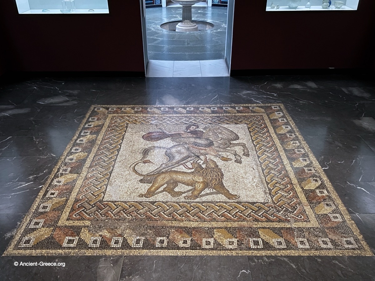 Mosaic with the myth of Bellerophon on the winged horse Pegasus, killing the Chimera. Late third century A.D. Found in the Roman villa of Bell-lloc (Girona). Imperial Roman.