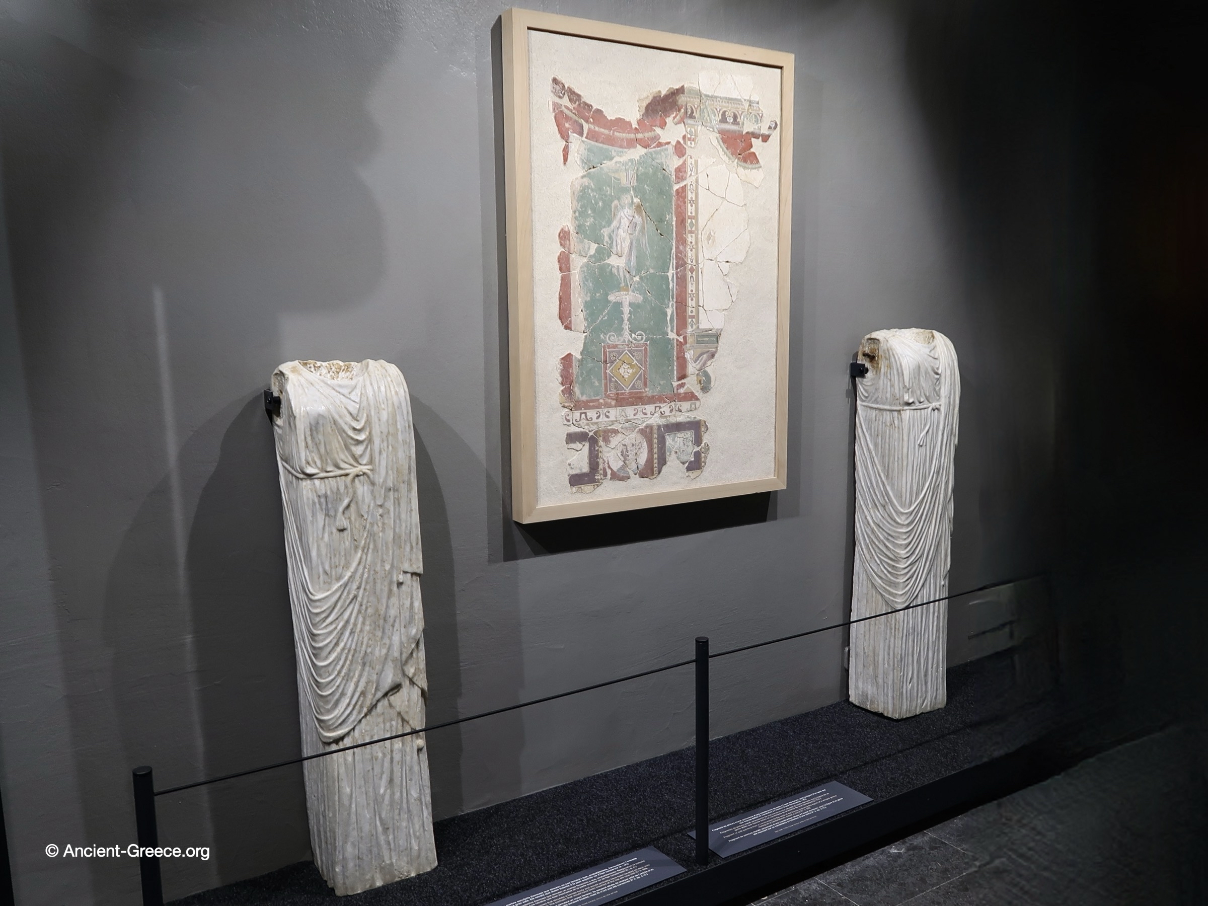 Sculpted marble pilasters (hermao) that simulate a female body and would probably have been located on each side of the entrance to a large room, and fragment of wall-painting from a construction to the west of the forum, featuring the ligure of a winged genie resting on a candelabrum, insido a niche (1" c. CE).