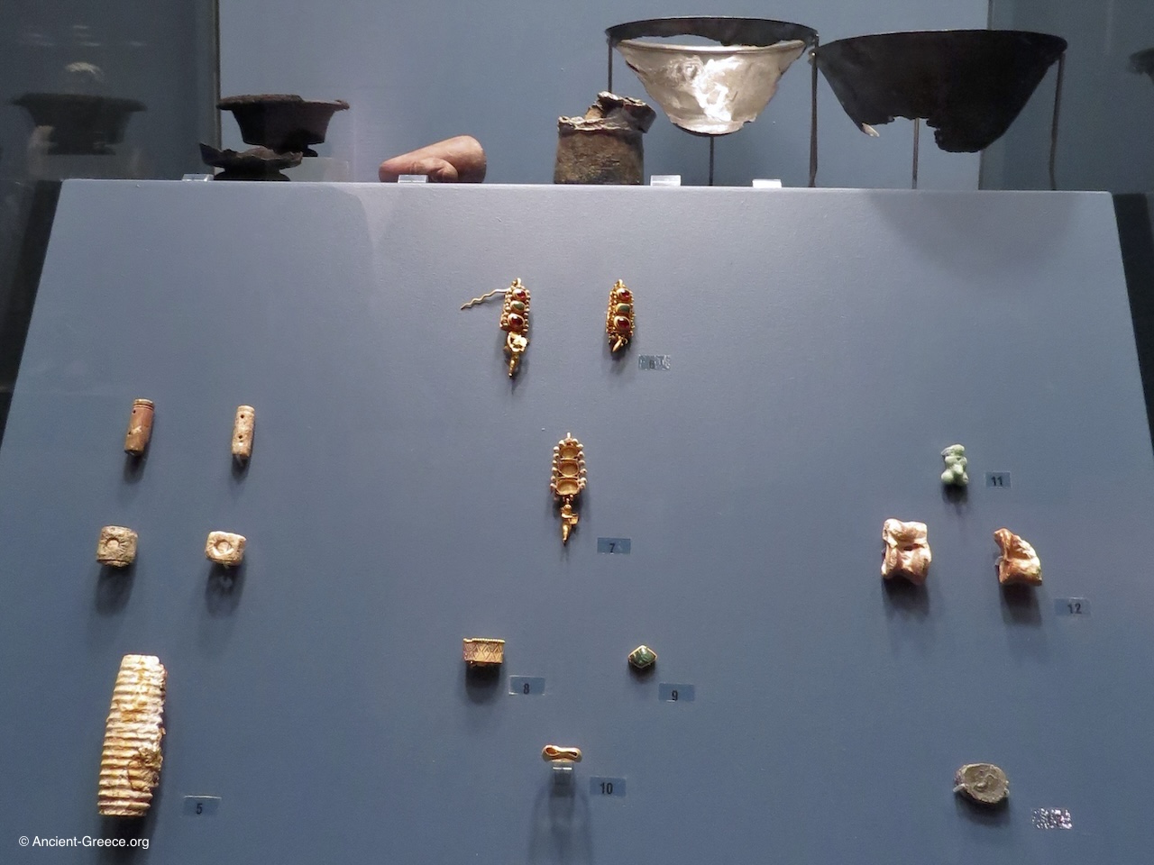 This is a collection of images of jewelry, and other assorted gold and silver artifacts from Ancient Greece. They were photographed in museums and archaeological sites.