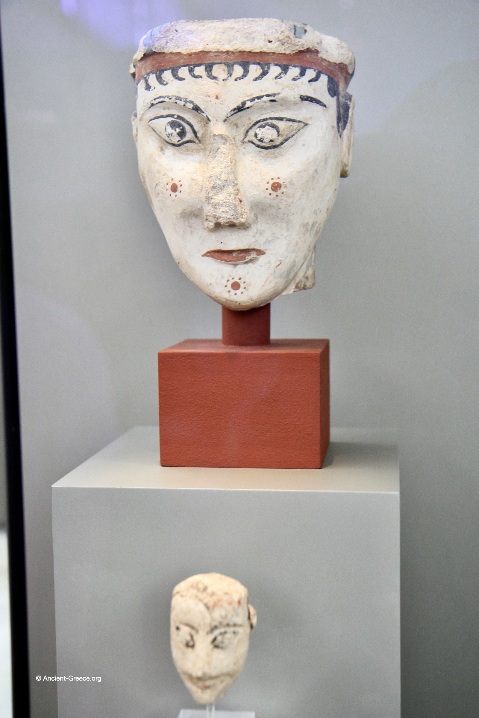 A plaster head of a woman and a small plaster head of a bearded man. 15th - 13th century BCE. Mycenaean Era.