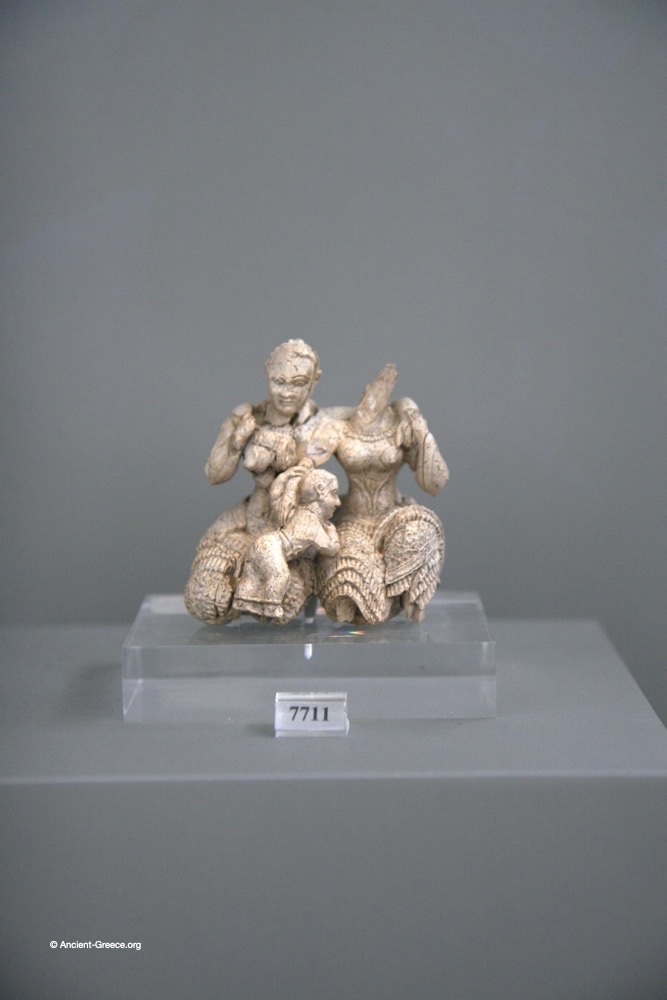 Ivory figurine representing two seated, bare-breasted female deities and a small child, possibly a young god. One cloak covers both women. Mycenae acropolis, palace area.